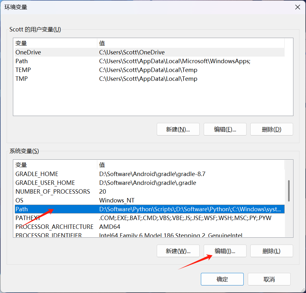 在系统变量一栏中找到Path并选中,点击编辑。