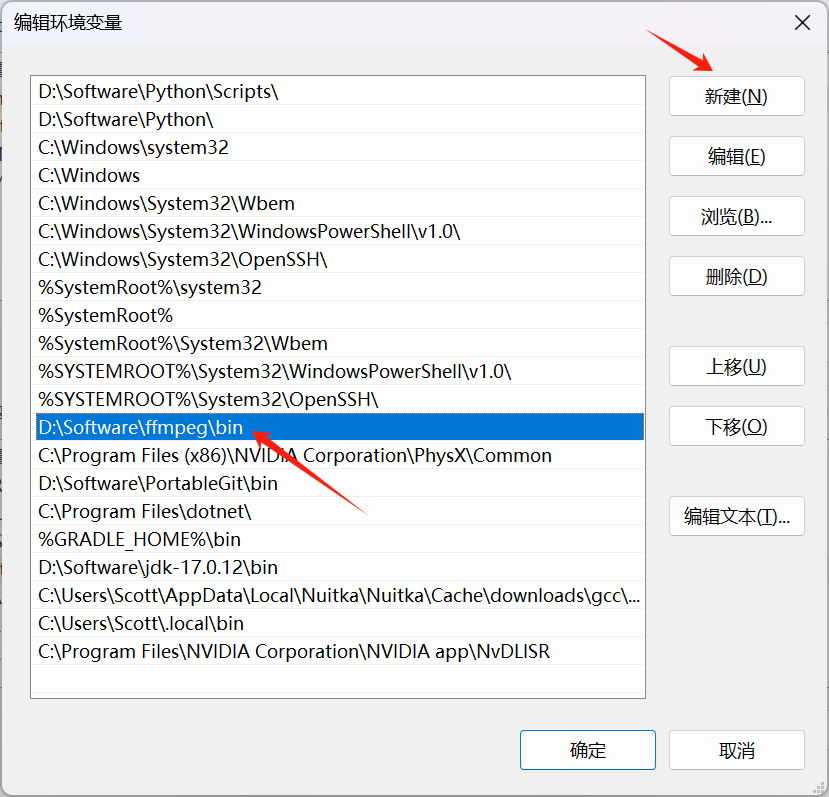 点击新建,填入ffmpeg.exe所在的文件夹(例如:D:/Software/ffmpeg/bin)即可。