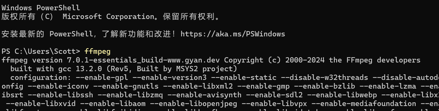 最后,在终端中运行ffmpeg测试环境变量是否创建成功。